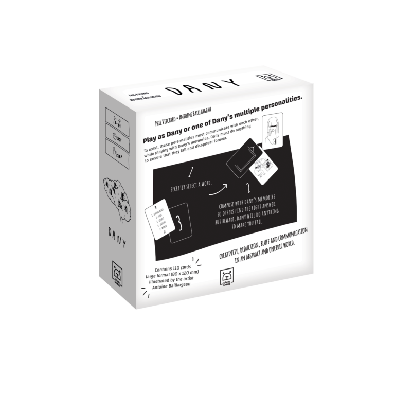 Each player embodies a personality in DAany’s head and one player will secretly be Dany’s true personality. Each turn, the Active Personality will be awarded one of five Ideas he/she will have to make the other personalities guess using Memory cards (illustrated cards). Once the cards composition is made, and after some discussion between the players, the one to the right of the Active Personality gives the answer of his/her choice and success or failure is given to all players. A new tour begins with a new Active Personality.