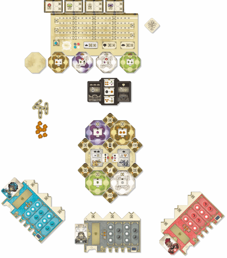 Vous disposerez, lors de chaque manche, d’un nombre déterminé d’apprentis à poser et à faire travailler pour générer des ressources et des Points de Vénération, qui sont les points de victoire du jeu.