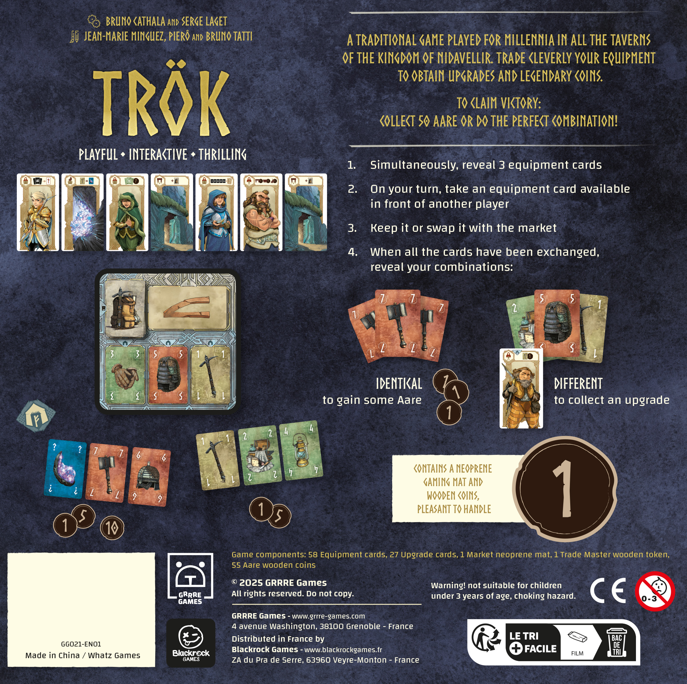 – Trök: choose 3 of your cards and reveal them: the highest total value determines the trade master. On your turn, pick a card in front of another player and add it to your hand or trade it with the market. It is then the turn of the player you just took a card from to pick a card in front of a player, and so on, until the cards have been taken.